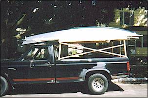 I painted Inscrutable with exterior acrylic latex house paint. She is white with hunter green trim on the chines and gunwales. The mast and spars are also painted hunter green. I ordered a white sail to be made for Inscrutable and I expect that to arrive sometime this week. I am going to truck top the boat. I have a rusty ’81 Ford Pick-up truck and I built a wooden frame over the bed for this purpose. As I was fashioning this, one of my neighbors hollered and asked if I was “moving to Beverly?” It is certainly not pretty, but it will work. Another neighbor donated carpet scraps for the cross pieces that the boat will rest on.