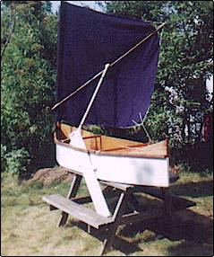 canvas salvaged from a rummage sale. A sleeve was hand sewn in the front edge to go over the mast. The corners were already