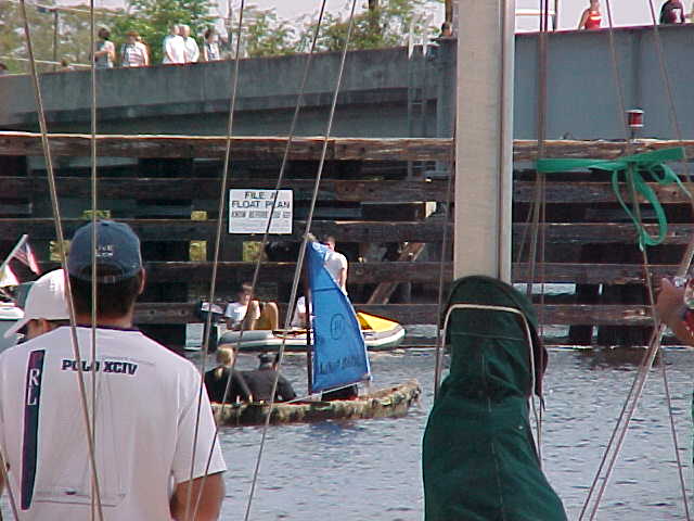 The entries paraded to the race start, which was up river from the bridge, and launched their boats. The wind was downriver. They sailed to a turn location below the bridge then had to paddle back upriver to the finish line.