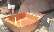 Alan and I both reviewed the drawings earlier that week so they were somewhat fresh in our minds. This was fortunate because neither of us had the foresight to bring the drawings with us that morning! We dragged out a long-neglected scrap sheet of luan ¼” plywood and laid it across a couple makeshift sawhorses. We followed a long tradition of ships' carpenters working with limited measurements and few tools to lay the lines for the dink (proof that good design plans are no substitute for proper layout).