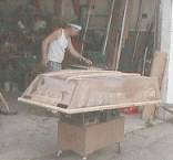 Thanks to Alan’s years of building experience the layout was completed in short order. Reasonably appealing curves were marked with a batten to conform as best we could remember to Don’s original drawings. A slight rocker was given to the sides. For a bit of graceful sweep, we used a trammel stick to reproduce the rocker along the sheer. The transoms were cut to best fit the curve of the sides when stitched to the bottom. We clamped on a few temporary vertical braces to prevent the chines from popping out of place and glued the seams with a basic filleting mix. All told, the boat was cut and stitched about 2-½ hours after we set down our coffee mugs. Before lunch, we completed as much could be accomplished in one day using