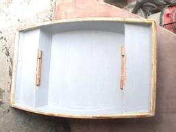 shorts in picture above) came down to visit and helped Alan build bow and stern seats (a modification of Don’s plans…no breasthooks since the seats tie the corners together while also serving as comfortable butt racks). A plank was milled, urethaned and suspended fore and aft between the seats, allowing one person to comfortably sit amidships. Handholds were cut. Rubrails and sheer strakes were milled and installed, along with runners along the bottom. All the seams were finished with fiberglass tape. The entire hull was copiously coated with generous amounts of epoxy to ensure durability and waterproofing. When we felt comfortable the boat was sturdy and structurally complete, we sanded and primed it to prepare for painting.