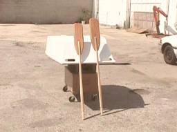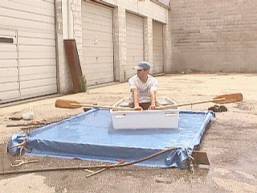 We were so excited about our unique oars that we couldn’t wait to test them. Unfortunately, the only water nearby was the backed-up sewer in the garage’s parking lot. Still, we weren’t going to let our poor proximity to navigable waterways prevent us from rowing this cute little dink! Like any determined boat builders with little else to do on a Sunday afternoon we built our own “lake.”