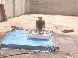 I needed a tarp for a camping trip I’d been planning. So I ran to Wal-Mart as fast as my Escort and the Philadelphia police would allow and picked up an 8’x10’ poly tarp. By the time I returned, the last coat of epoxy on the oars had dried. We found some scrap 1x6 lumber lying around the yard. With 2x4 blocks for corner bracing, we built a box approximately 6’x8’ and 6” deep. The box was leveled using the corner braces as shims. We put the tarp in and weighted it down to prevent it from blowing away. The hose was turned on and within a few cups of coffee we launched the Twig on its maiden voyage. With thick smog rolling in from the Sunoco plant we set ourselves adrift towards the concrete horizon!