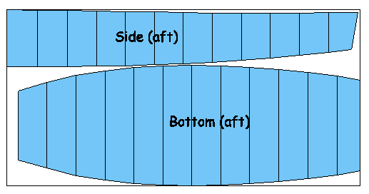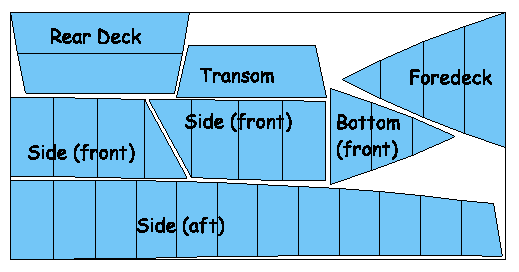 The front bulkhead is composed of four pieces of 1" lumber and also serves as a "butt plate". Since one inch is not much width for a butt plate, it may be wise to join the side and bottom parts by overlapping a strip of fibreglass tape on the outside before bending them over the bulkheads.