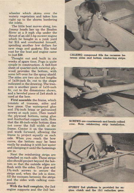 whether she (Mrs. Tench) knew if there had been any plans made. She said she wasn't sure but if I would like I could call back shortly when her husband was home and he would know for sure. When I called back and introduced myself, Mr. Tench broke into uproarious laughter and explained that Mrs. Tench had explained that some crazy Canadian (my words) had called to inquire about drawings for Pogo. Well we just had a great time talking. His son is now 58 years old and retired. But yes he had some drawings around and S & M had done an article on the little boat, and he would only be glad to send me a copy IF he could find them, it had been 41 years since anyone had called about the little boat. I got the plans in the mail Thursday. What a great experience. Any way