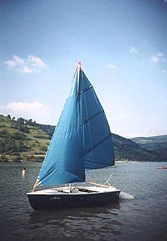 It is 3.5 meters long and 1.35 beam, and it is made of GRP. It has a V bottom at aft, while the cross sections towards bow are rounded. It is manufactured by a company located in Galati (port at Danube) and it costed (only the hull) in 1997 275 US$ plus taxes. There are two versions of the boat: for rowing (mine) and one for sailing which has full deck with watertight cockpit. As this version was more expensive (350 $), and it was without rig and sails, and also I was not sure that it will work, I decided for the first version thinking that if sailing will not be possible I will use it as a rowing boat. They were very kind and equiped the boat with a daggerboard trunk and also delivered me a daggerboard and a