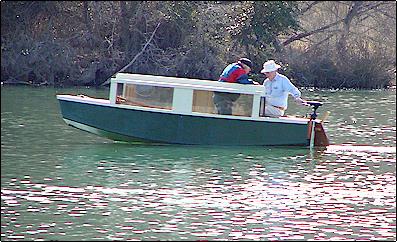 I got the IMB far enough along to get the bottom wet. Still some bugs to work out with the lugsail, but we did manage to try her out with a borrowed 32 lb. electric trolling motor and battery.