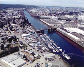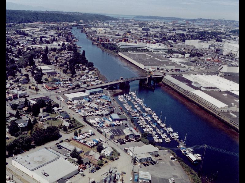 north downriver with Elliott Bay and Puget Sound in the Background.