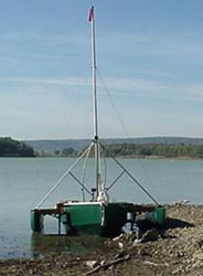 The mast is stayed by two aluminium tubes which lead lateral forces directly to the floats and two additional galvanized steel stays which should only transmit the forward-directed parts of the sail force.