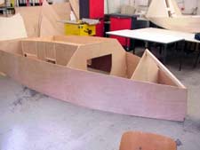 I bought the plywood and a used trailer in spring 2001. Unfortunately the trailer was a bit to short for the boat, but I thought I could get away with it if I shortened the boat to 4.70 m. At the same time, my wife stated clearly that she would not sleep in such a small boat, and thus the aft cabin became obsolete. I changed the design by doing two straight cuts through the given hull lines (my father had already made the stem and I didn't want to throw it away): I cut off the last 30 cm and the top structures.