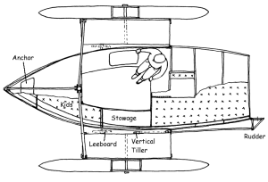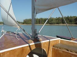 The leeboards are glassed on the outside so that they are very strong and very light - they must be held down in the water against their buoyancy by strong rubber bands pulling them forward and a rigid line running aft. The lines end has several knots and is led through a U-slot so that its length (and thus the position of the leeboard) can be easily adjusted.
