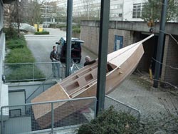 Since the hull is made from Okoume, we glassed almost every part of the surface (they say it rots really fast). Although I always used latex medical gloves, I finally got allergic against epoxy. My hands appeared like cauliflower and itched for two weeks! In March 2002, we had to get the boat out of the workshop, which was not easy since the workshop was in the basement. Here is how we did it: