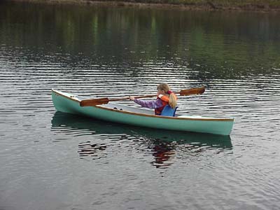 Seating is a basic foam cushion, with a webbing strap stretched between the gunwales for back support. A lighter paddle will replace the original, which was built to my usual ice-breaker specifications, but is much too heavy and powerful for the needs of a nine-year old girl.
