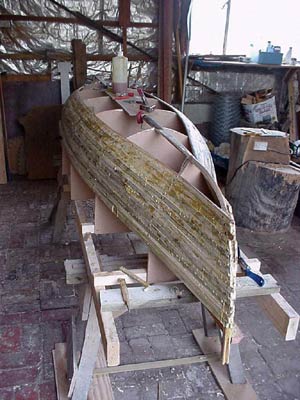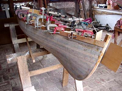A couple of stretcher pieces had to be added as we worked towards the waterline at either end as the bend in the strips was becoming very banana-shaped and complicated by a very tight twist between the first mould and the stem, producing a delightful “kiss” in the bow. (see photo above)