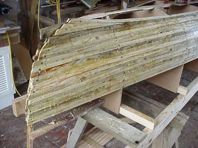 Pulling the 1000 metal staples out wasn’t much fun, but was accomplished easily with a sharpened hooked tool and a pair of bullnose pliers. Any damage done at this stage would be repaired later when the hull was faired with epoxy before glassing. This rough-and-ready procedure would be little use if clear-finishing the boat, but as I prefer a painted, work-boat finish, staples are a very practical method of holding it in place while the glue dries.
