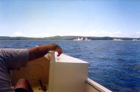 I couldn't beach the boat because of the coral, so we waded in knee deep water to the beach and stood on a mound of dead coral. This island has a prehistoric feel to it. Inside the dead coral ring is a swamp, and inside that the island proper. I didn't go to it, I didn't have the foot wear and I was concerned about any lurking Mud Crabs. They can shatter a beer bottle with their claws, so what could they do to unprotected toes ? Wayne agreed with me on this, nodding his head furiously. The fishing was pathetic, not a single bite. It was time to move on, the sun was up and the wind had changed to the predicted Southerly which gave us an unpleasant head sea on the way to St Helena .