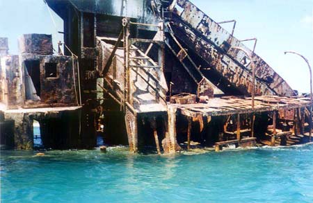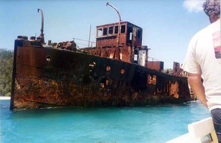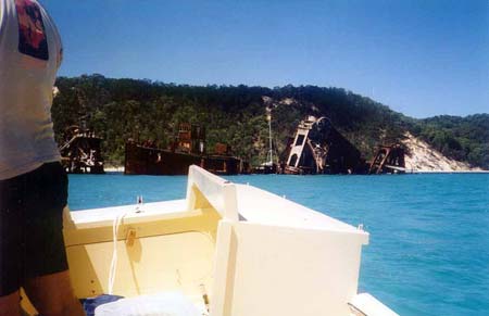 Moreton loomed larger every minute and I began taking snapshots each time we stopped to rest my hand. The outboard's throttle is the classic twist grip on the tiller, holding it fully open was a strain. Obviously I would need to do some work on it when we were back home. I headed for the "Big Sandhills", veering north as I approached and wound up at two rusting steamship hulks. Skeletal frames and boilers, not much else left. We were trying to decide wether to go north up the island or south, both directions held interest but the need for fuel made north a sure thing, there was a petrol station at Bulwer.