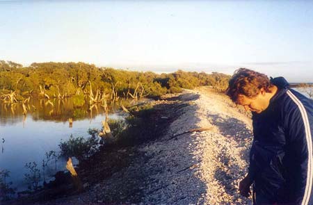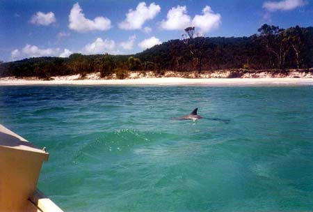 Then the dolphins came, edging closer when I slowed down and swam around the boat when I stopped. One of them dove under the boat and fooled around down there which worried me, the motor was still running in forward gear. He resurfaced a minute later. This had Wayne quite excited, you know? He loves animals, and dolphin are highly regarded by everyone I know. They became bored with the boat and swam off. To cap it all Wayne noticed something move in the water as we were speeding along and insisted I go back. I was going to tell him to jam it, I was sick of stopping for every little flicker in the water that might happen to be something of interest, but I went back instead. It was a Dugong, I only just saw it before it dove out of sight. I have never seen a dugong in the flesh , and this was only the briefest of sightings but I felt it was worth it, just for the sake of saying I had seen one. The bay has large herds of them but they are a shy creature, and rarely seen.