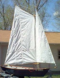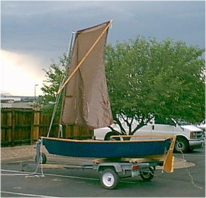So, here is the finished Sharpie. It floated without leaks, was an absolute lady on the water. Well, we can’t have that! I am in the process of re-rigging with a gaff main and a jib, total gain of about 35% sail area. I mocked the rig up with polytarp, old windsurfer mast and closet rods.