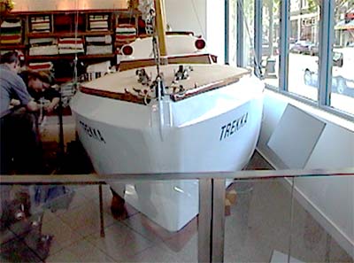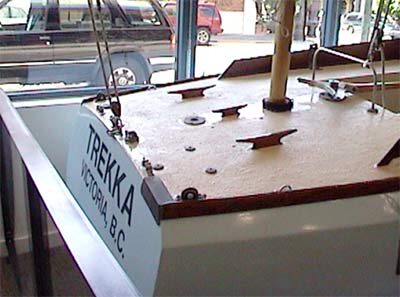 I entered the Hudson Bay Co store and came upon the saddest boat display I have ever seen. Trekka was sitting on the floor supported by some 4X4's without keel, rudder or proper main mast. This must truly be a sad time for the little boat, to finish as a window sales display in the Indian Blanket Department. The hull and deck were painted and shiny yet the mast was obviously chosen for the boat because it would clear the ceiling. No signs or display information was available for the boat; it was just a big sales display. A young boy asked his father whose boat it was and the reply wa,s "It was built here in Victoria and sailed all the way to California". He credited the store clerk with providing that information. Poor Trekka -a sad end to a great adventure.