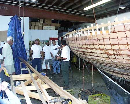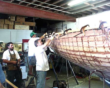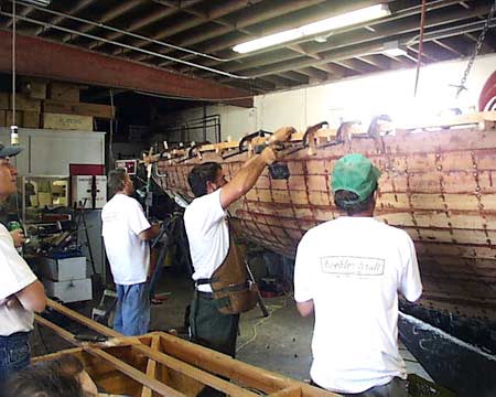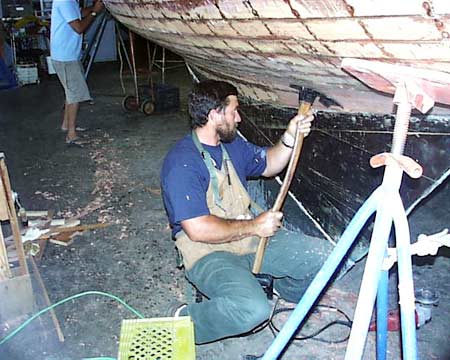 demonstrates use of an adze to fair the hull