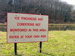 We'd had a warm spell that melted about half the lake! It was already up to 34 and I had water,.. but the landing ramp was still packed in! Further up stream it was open and the snow was gone. Just to the right of the sign is where I slipped the boat in. I read the last part and it said enter at your own risk! Looking narrowed eyed to the right and left quickly...just to make sure nobody was coming down the road, I took the risk and headed toward the lake which is about a mile!