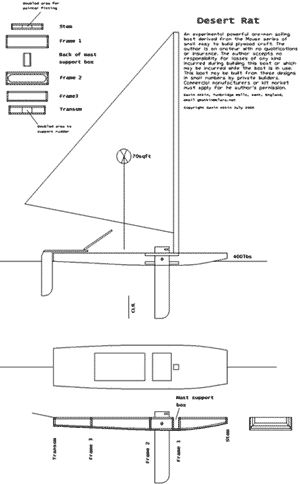My friend the Chaplain was delighted with the plans I drew, but his building plans were interrupted when he and his troops were suddenly called to Liberia. The boat he called the 'Iraqi Freedom Yacht' and I called the 'Hot Rat' because of its desert origins and hot performance hasn't yet been used for its intended purpose, but I can't help thinking that the design has a lot of potential as a boat for teens and young men and women who sail for fun in many parts of the world. It must be just about the cheapest club racer in existence, and I swear that with a few tools and odd bits of metalwork it could be built in 12 hours or less, probably a lot less if the builder is experienced in the ways of instant boat building. What could be better or more fun?