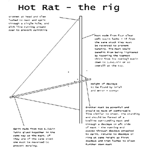 With a design brief like that, the answer seemed obvious - the Hot Rat is a narrow 12ft scow with a flat bottom, and largeish leg-of-mutton polytarp spritsail and a long flat run that should have it planing in a moment. It swallows up just three sheets of quarter inch ply and is built with internal chine logs. I expect regular capsizes, so substantial bouyancy tanks are included to prevent the boat from sinking.