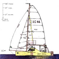 Hot Chili was drawn by hand in 1999, aiming to be the most attainable 2-person performance pocket yacht to date. By attainable I mean it can be swiftly built in a garage with the spare time and funds from an average wage-earners job. The term performance includes both on the water (easily driven and handled) and off (strength & longevity).