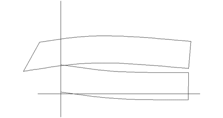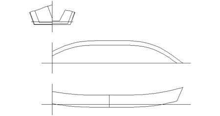 The lines are a touch unusual; let me explain. If you try to bend most anything, you will see that it bends mostly in the middle, and the ends are straight. This is because you have a longer lever arm on the middle, and only a short lever at the ends. So I drew the boat with the curves straight both at the ends and in the middle where the two parts join. It does look a touch unusual. Real designers like John Welsford and Evan Gatehouse do not give in to the physics of the material the way I have. John suggested leaving the end of a chine, for example, long enough to lever the desired curve into it, then cutting it to length when the epoxy set up. Evan, for his two part dinghy, suggested building it in one piece and then cutting it apart. It seems to me that this would put a lot of strain on the glue and fasteners.