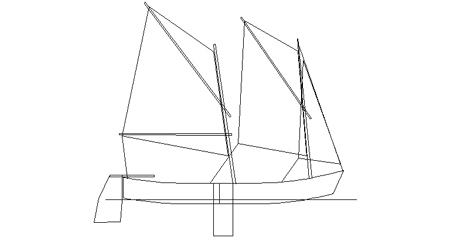 It was fun drawing up the rig. Part of the idea was that there would be two people to handle the sheets. I was greatly surprised to find how hard it was to get enough area with the schooner rig. Area is pretty much a "luff times foot" affair, and chopping the foot into a couple pieces doesn't change the length of luff required. The rig shown is a measly 65 sq. ft., and I don't suppose the 5 sq. ft. jib is of much value. Even so, the mainmast is 9 feet long.
