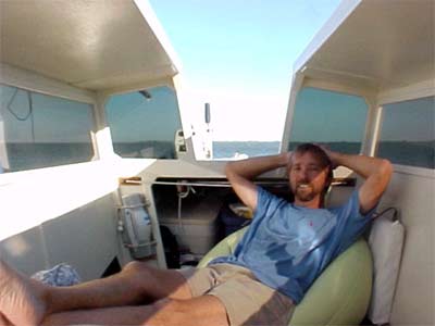 Mid August and I had two days off without any plans. A small self-contained sailboat like my Michalak Jewelbox Jr. means that after a few minutes packing an ice chest, connecting the trailer to the truck, tossing off the blue tarp and a quick stop to buy some of our $2.89 a gallon gas, I was off to the California Delta! Three hours later I arrived at a small "Mom and Pop" marina to launch. Fending off the usual "what kind of boat is that" queries, I was soon sailing in the warm Delta waters, trying out the new "bean bag" cushion.