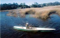 Egrets and Herons, well accustomed to casually getting out of the way of outboard motors, hastily vacated with worried expressions as I windmilled, churned, slapped, and splashed upstream. After becoming quickly winded, I returned with much better technique traveling mostly with the wind and tide. At one point, backing out of a narrow inlet we decided to explore, I actually wacked the poor girl on the head with the other end of the paddle-instilling a valueable lesson regarding accepting rides in experimental, amateur piloted craft.