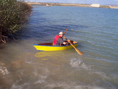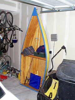 In the end it worked out pretty well. Andy has a shelf that holds quite a bit of his lighter weight camping gear, as well as the oars, and his garage is more spacious despite also storing a boat as the camping gear is stored on the shelf and out of the way. The boat ended up weighing about 45 pounds, and he cartopps it on his Mazda with only a blanket for padding. It rows easily, and in time may aquire a sail rig (another dangerous and desperate idea....)