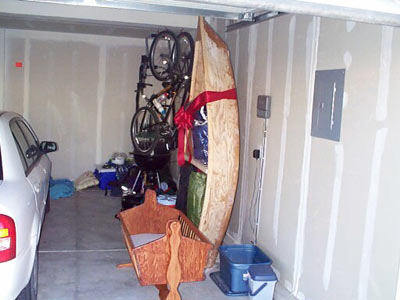 My second son lives only two hours away, so as I looked at his cozy garage and cozy yard I knew that he would never have room to have a big boat and trailer.... he had quite a pile of out door gear in one corner of his garage. Nor would he be likely to be able to have the time needed to build a boat or even a shelf (5 - count'em vacation days/year - Yikes!). So after a late night web session where I had seen several One Sheet Skiff's built, and the suggestion that these could indeed be stored indoors, I determined that I would build him a 'shelf' for his birthday.