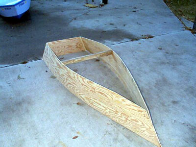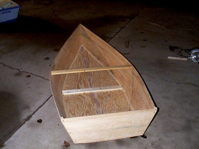 I wasn't able to build the shelf/boat out of one sheet. Andy and I are both about 240 lbs, and I knew that I would want more than 9-1/2" of height on the side of the boat, so I borrowed a 13-1/2" x 8' strip from another boat that I am working on, and sort of enlarged as I went along. That extra strip allowed higher sides and a 28" wide bottom.