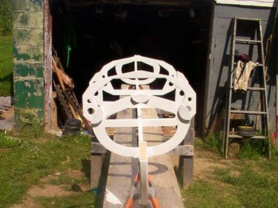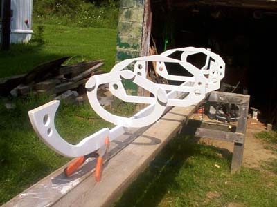 The side photo show the "rocker" I cut in and the keel is made from a nice piece of pine 1x3 I got at Home Depot for 3 dollars and fifteen cents! The original plans use a straight 1x2 for the keel that makes turning a little more difficult. It ain't much but it does make a difference. What you are looking at weighs 7.5 pounds!