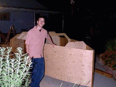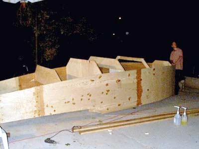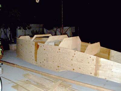 Jim had a valid point when he advised in one of his letters that you shouldn't start a boat over 16 feet without some serious thought. I could tell that it was going to be pretty big when I had the side seams taped and laid out on the patio. But tonight it really came alive when my son Daniel helped me nail and screw all these odd sized wood pieces together.