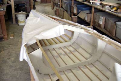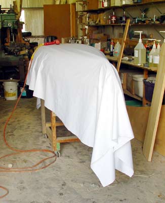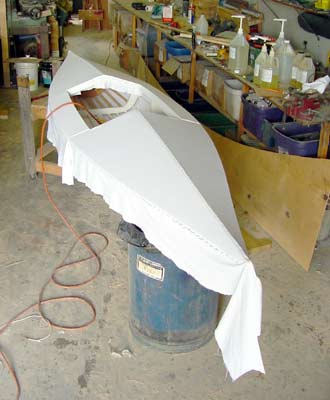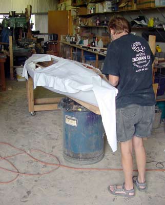 Finally, all was trimmed. The next step was to wet the whole thing to shrink the fabric. Sandra wondered if we had mistakenly got pre-shrunk fabric, as there did not seem to be much shrinkin' goin' on. Good thing she got the skin nice and tight in the first place.