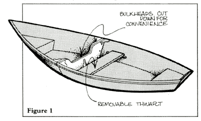 With small boats, it's usually easiest to make a cardboard or thin plywood pattern of the bulkheads and then have a good long look at the pattern in place to see if there will be conflicts or problems. The top of the bulkhead can be cut away if it interferes with seating, rowing, or sailing arrangements, but it's best to leave the bottom edge of the cutout well above the waterline. Otherwise, you'll need a waterproof gasket between the bulkheads (Fig. 1-2).