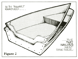 Because hull types and individual requirements differ, give some thought to exactly where the bulkheads should be placed. lf you locate them precisely in the center of the hull, one half won't fit inside the other. If nesting is a priority, do some measuring to ensure that the smaller half fits inside the larger. Since bulkheads can go almost anywhere in the hull, it's possible to arrange for a specific use or to fit a specific location, like the cabin top of a larger boat or back of the family wagon. Use as many bulkheads as are necessary to accomplish the objective.