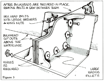 Drill the bolt holes after the bulkheads are in place and before the final cut is made to separate the hull. They should be drilled at exactly 90 degrees to the face of the bulkheads to ensure correct alignment. All holes in the bulkheads should be sealed with a liberal application of epoxy, then redrilled to the correct size for the bolts. This is important to prevent