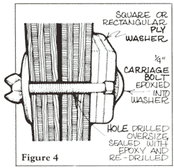 The hull sections are held together with stainless steel or bronze bolts and washers spaced around the perimeter of the joining bulkheads (Fig, 3). Hex head bolts, used with large washers on either end, can be tightened with a wrench of appropriate size kept handy in the boat, perhaps on a lanyard. The bolts may also be equipped with thumb screws with the head epoxied into large rectangular ply wood washers, allowing removal and tightening without a wrench (Fig. 4). Another option is to epoxy glue the bolts and plywood washers permanently in place on one of the bulkheads so they're always handy for re-attachment.