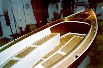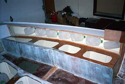 • I wanted to make sure my boat wouldn’t sink if I managed to flip it. With that in mind I put individual polyethylene air chambers (sealed, empty milk jugs) behind the seat backs. They are secured in place so they never rattle around. I also made the forward bulkhead solid instead of making large cutouts in it as the plans describe. This creates a large air cavity in the nose.