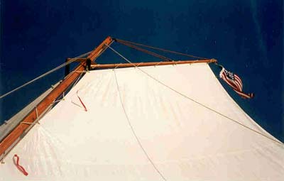 • Instead of attaching the mainsail to the mast with mast hoops, I laced the sail to the mast. It saved me the trouble of making hoops, and works just fine. (Last winter I sailed on a 76’ schooner out of Key West, and darned if her big sails weren’t laced to the masts.)