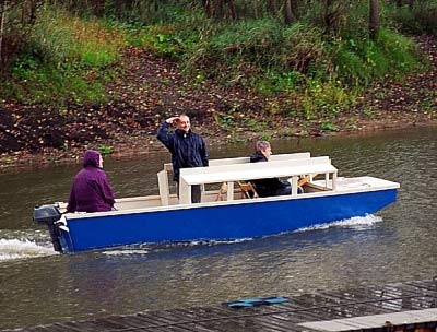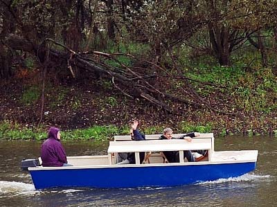 I've received a few launch day photos from one more friend's camera. I still don't know how many cameras were in use that day. This is the reason of nice surprises we have from time to time. I'm sending here one of them showing our Campjon coming back from river cruise. It shows how stabile and comfortable the boat is having 3 men crew onboard. It also shows clearly gentle arch in bow part, generated by fact that bottom was constant width from bow to stern. Jim Michalak made use of that interesting solution in his jonsboat, campjon and polepunt designs .