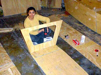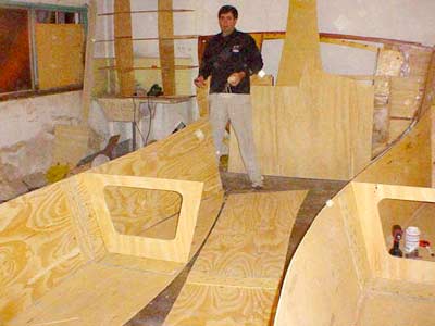 Beginning to mount the hull, tying the plywood with thick thread adjusting it to the main frame.