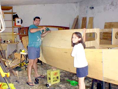 My daughter Lucía and me, drilling the holes for the screws to fix the port cabin lateral.
