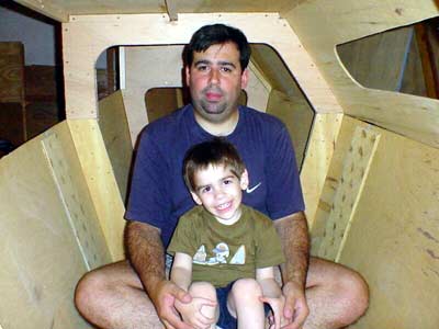 My son Juan and I testing the interior of the starboard hull for comfort with the roof in place.